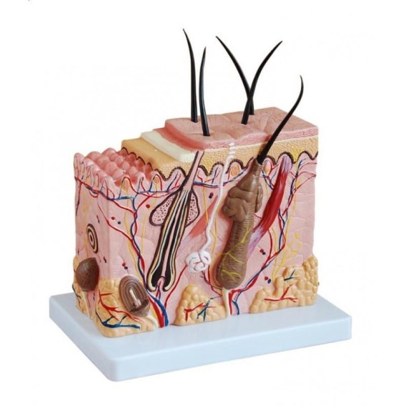 Zamontowany model skóry człowieka został na białej plastikowej podstawie. Całość ma szczególne zastosowanie podczas zajęć z anatomii człowieka wśród studentów, ale również cieszy się zainteresowaniem wśród uczniów oraz różnego rodzaju placówkach medycznych.