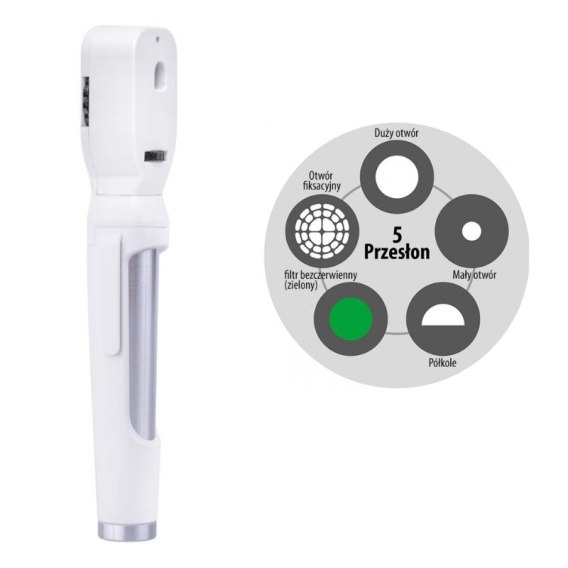 Oftalmoskop wyposażony jest w pięć przesłon, które pozwalają na dokładne badanie każdej części oka. Otwór fiksacyjny pozwala na ustalenie punktu centralnego, filtr bezczerwienny (zielony) pozwala na dokładne zobrazowanie naczyń siatkówki, półkole pozwala na badanie dolnych części oka, a mały oraz duży otwór pozwalają na ogólne badanie oka oraz obserwację reakcji źrenic na światło.