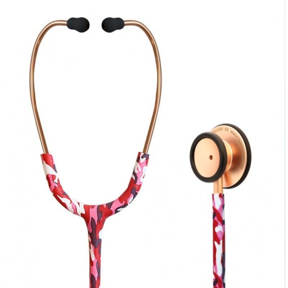 Rose Gold Satin Camouflage to stetoskop internistyczny, który posiada głowicę podwójną z tzw. „pływającą" membraną. Daje to pełną możliwość osłuchiwania zarówno tonów wysokich jak i niskich, bez potrzeby przestawiania głowicy z membrany na lejek. Wystarczy zaledwie delikatny nacisk, aby słyszalne były dźwięki o niskiej częstotliwości. Przy zwiększonym nacisku słyszalne są dźwięki o częstotliwości wysokiej.