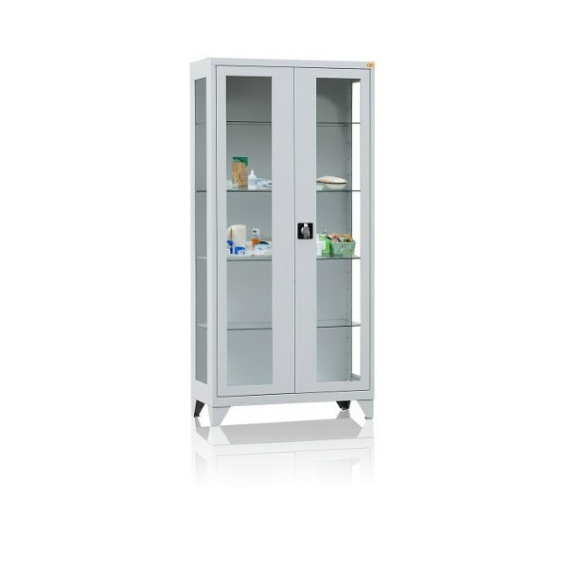 Szafa medyczna posiada dwa skrzydła drzwi uchylnych, zawieszone na zawiasach kołkowych. Wykonana jest z blachy czarnej o grubości 0,8-1 mm. Drzwi i boki szafy posiadają przeszklenie wykonane z szyby hartowanej, zamykane są zamkiem baskwilowym, ryglującym w trzech punktach i wykończonych uchwytem klamkowym. Szafa wyposażona jest w 4 półki wykonane ze szkła hartowanego o maksymalnym udźwigu 25 kg. Malowana jest farbami proszkowymi (epoksydowo-poliestrowymi) w kolorze RAL7035 (jasny popiel).