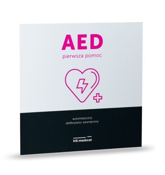 Tablica informacyjna zawiera wyraźny komunikat „AED pierwsza pomoc” a także ikonę serca. Jest to komunikat wskazujący na obecność defibrylatora w danym miejscu. Tablica dzięki wyraźnym napisom i odpowiedniej zwiększonej wielkości doskonale wkomponowuje się w otoczenie i wyposażenie recepcji, biura lub do większej powierzchni na przykład galerii handlowej.