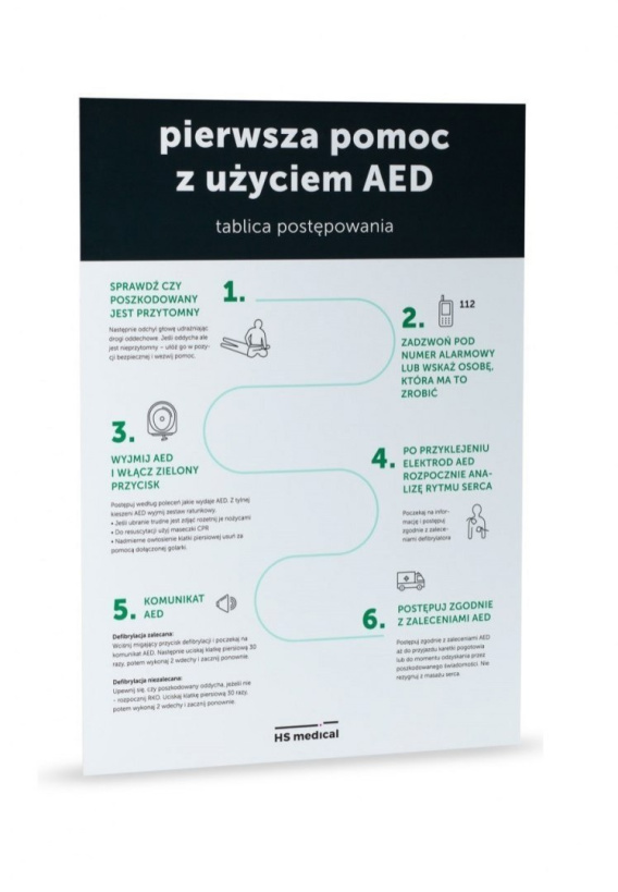Oznakowana tablica informacyjna, zaprojektowana z materiału PCV o wysokiej jakości (matowy laminat). Jest to tablica, która w prosty i przejrzysty sposób prowadzi przez cały etap postępowania ratowniczego, jest to idealne uzupełnienie komunikatów wydawanych przez urządzenie (defibrylator) podczas akcji ratowniczej.