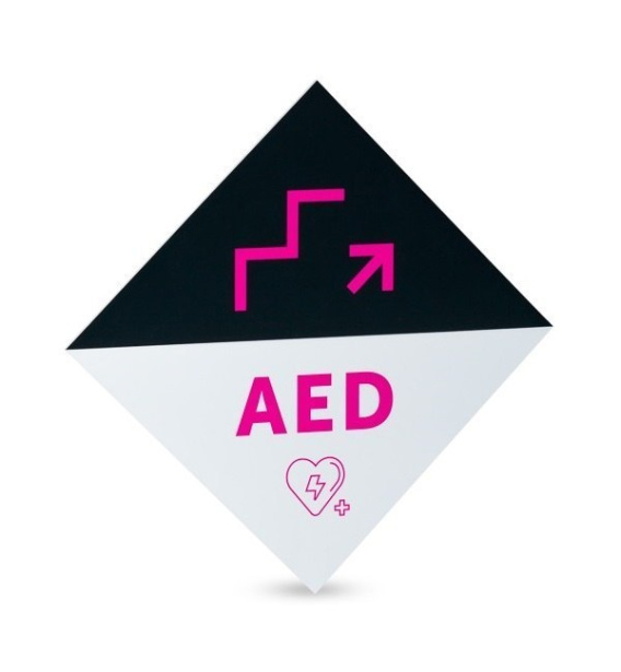 Tablica pozwalająca na szybką lokalizację defibrylatora AED na dużych powierzchniach obszaru. Tablica tego typu ma zastosowanie we wszystkich budynkach, które posiadają piętra i schody – czyli na przykład budynkach mieszkalnych, biurowcach, galeriach handlowych. Przeznaczeniem tej tablicy informacyjnej jest oznaczenie miejsca, na którym wyższym piętrze defibrylator się znajduje.